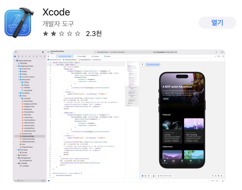 Xcode의 경우 Apple 공식 IDE로 ios 앱 개발 시 사용된다.